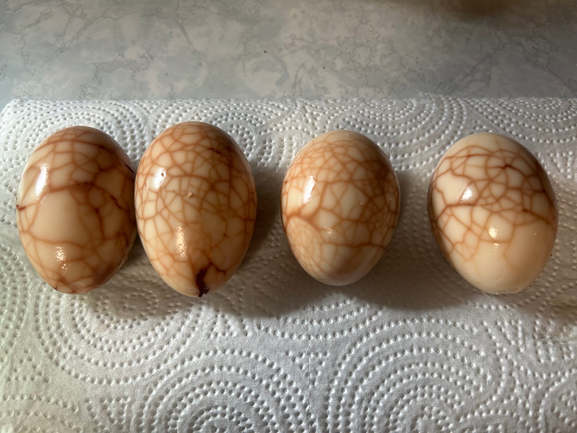 Remember the salt-encrusted quail eggs? I also tried tea eggs—you boil them, crack the shells, and simmer them overnight in tea. They’re pretty, and they taste… pretty okay. The tea flavor isn’t overpowering.