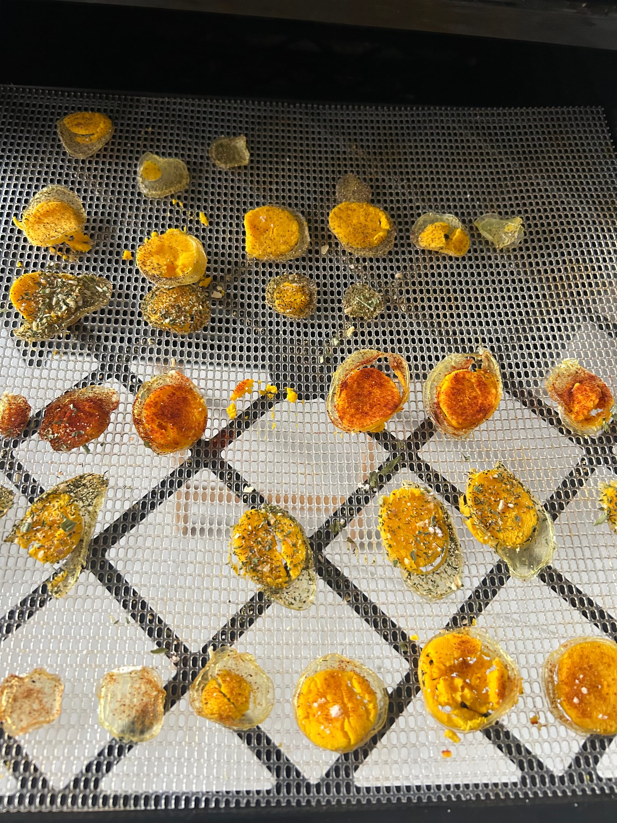 I also tried egg jerky, which is exactly what it sounds like—and it was an epic failure. Boiled eggs sliced thin, seasoned, and dehydrated until chewy. Except they never got chewy. The whites turned into super-crunchy kettle chips on crack, while the yolks stayed the consistency of a hard-boiled yolk.