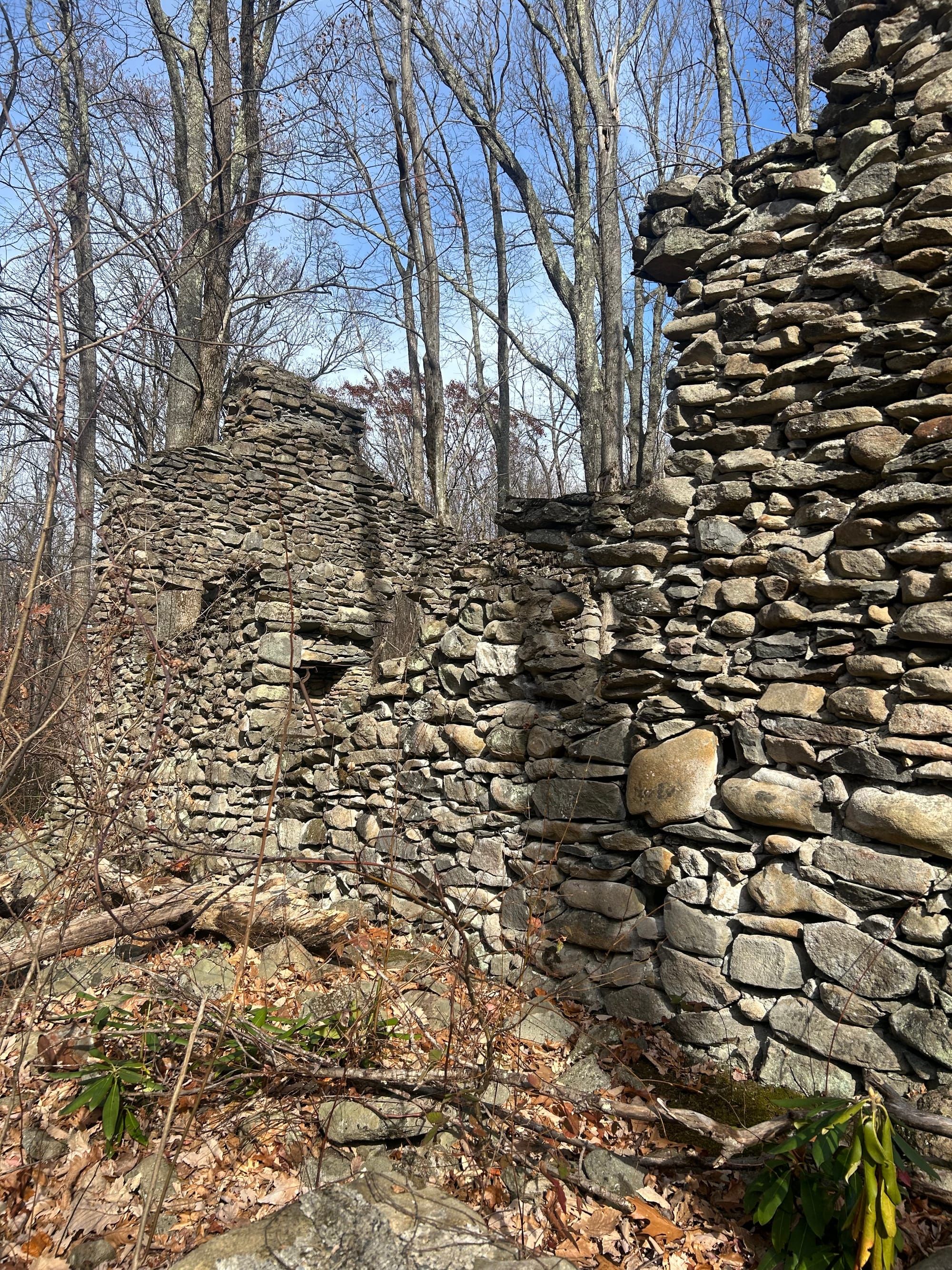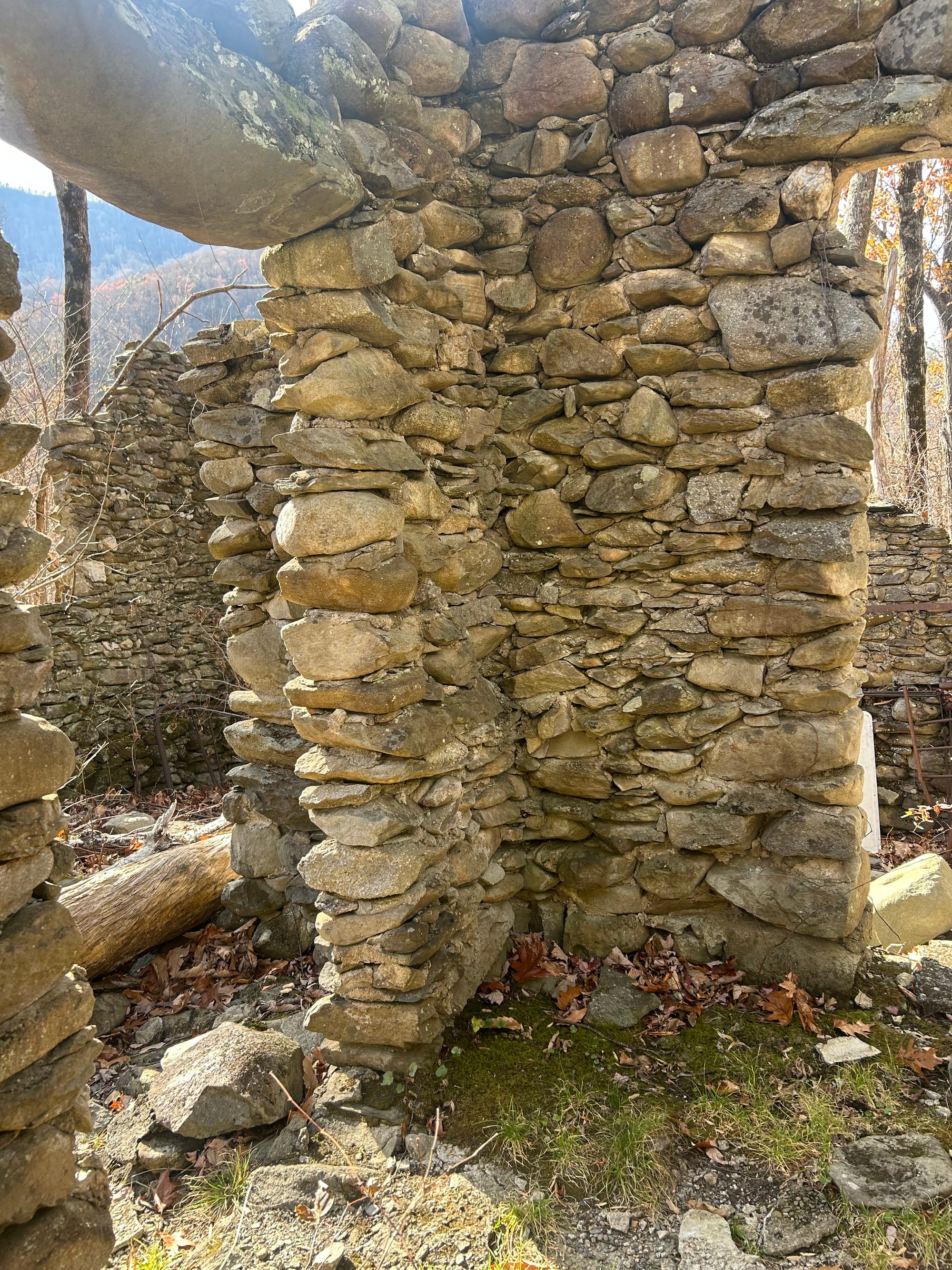 This was the most unmaintained trail I’ve ever been on in that park — climbing over and under fallen trees, through pokey vines, across loose rock creek beds. No blazes. Leaves covering everything so the trail just looked like forest. And since I have the sense of direction of a concussed pigeon, I relied entirely on my friend and AllTrails. She said we were still on the path, so we kept following the little line until we finally reached the Rock House.