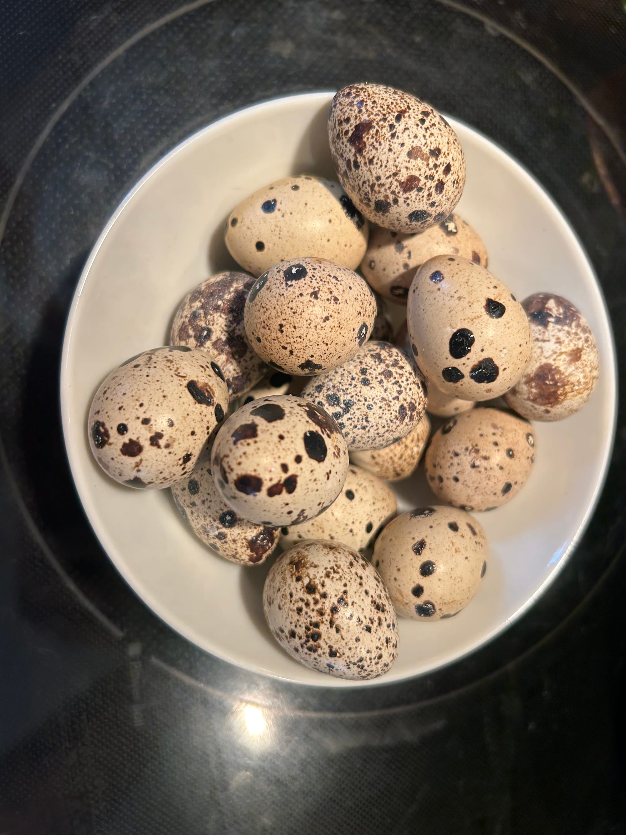 We’re getting about six quail eggs a day, which adds up fast. I’ve made all kinds of weird shit with them: quail egg mayo (“quailo”), Scotch eggs (baked, because fried foods exit me at warp speed), and even salt-sugar cured yolks. That process was… involved.