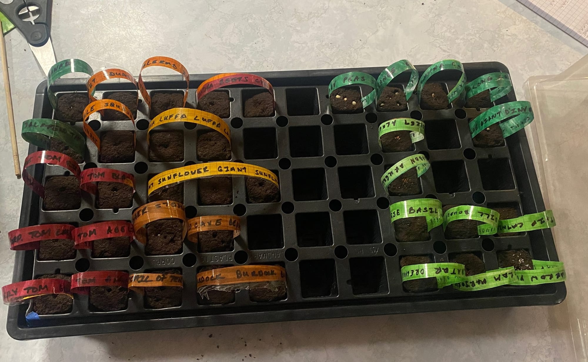 Dennis built the bed, and we’ve been filling it up. I started plants for the garden this weekend and don’t think I over did it too much. I also rescued four muscadine grape vines from Lowe’s at the end of last season. Not my favorite grape, but they survive here and come back every year, which earns them a spot.
